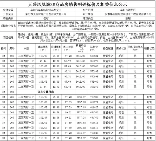 此次明码标价备案为3#、4#、5#、8#共523套住宅房源,住宅备案均价约5900元/㎡。数据来源于阜阳市发展和改革委员会(阜阳物价局)。